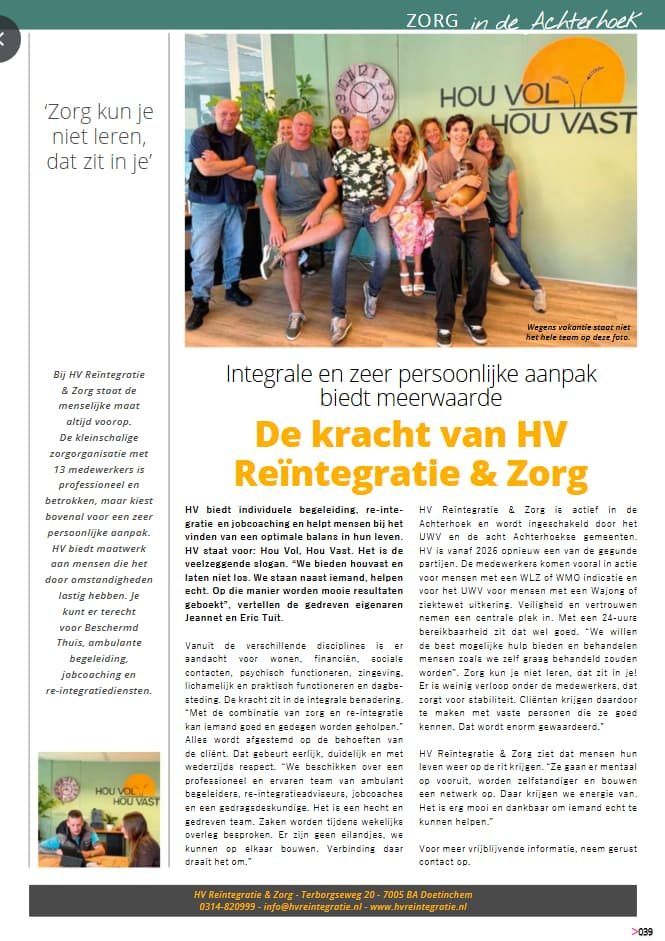 Uit ‘Mijn Magazine’ zorgspecial september 2025In dit artikel van Zorg in de Achterhoek laat HV Reïntegratie & Zorg zien hoe hun persoonlijke, multidisciplinaire aanpak cliënten helpt stabiliteit, zelfredzaamheid en duurzame resultaten te bereiken.Lees verder Uit ‘Mijn Magazine’ zorgspecial september 2025